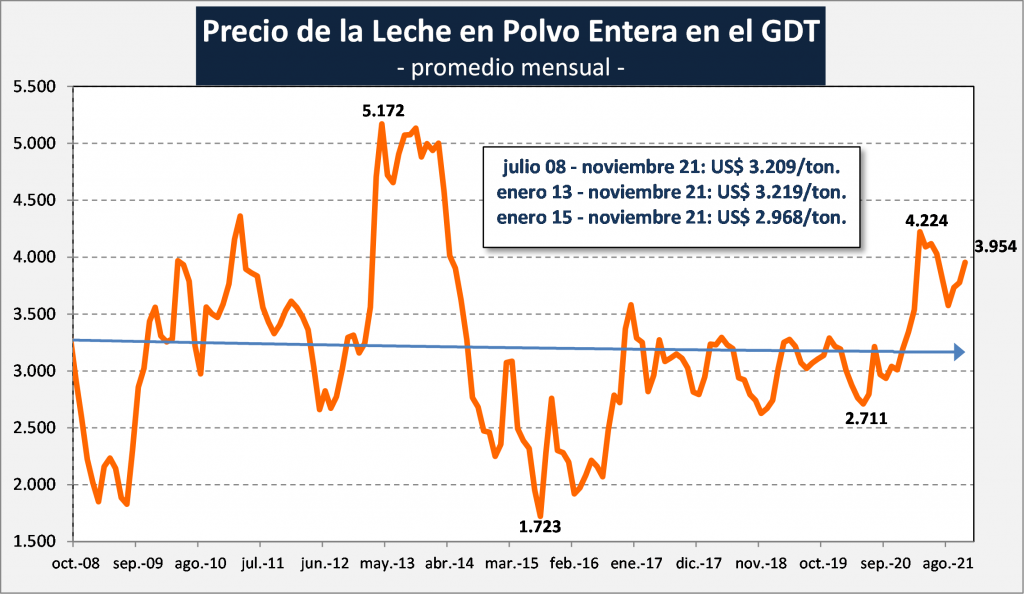 Como se puede observar en el gráfico que confeccionó el Observatorio de la Cadena Láctea Argentina (OCLA), los precios de este 2021 también están bastante por encima de la media histórica que actualmente está en torno a los 3.209 u$s/tn en la serie de 13 años, y en 2.968 u$s/tn en la serie de los últimos 6 años.