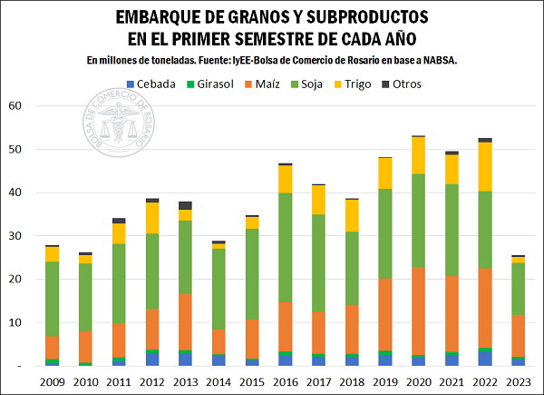 En similar sentido, con embarques de granos y subproductos por 25,6 millones de toneladas, los despachos del agro entre enero y junio fueron los peores del primer semestre desde, al menos, el año 2000.