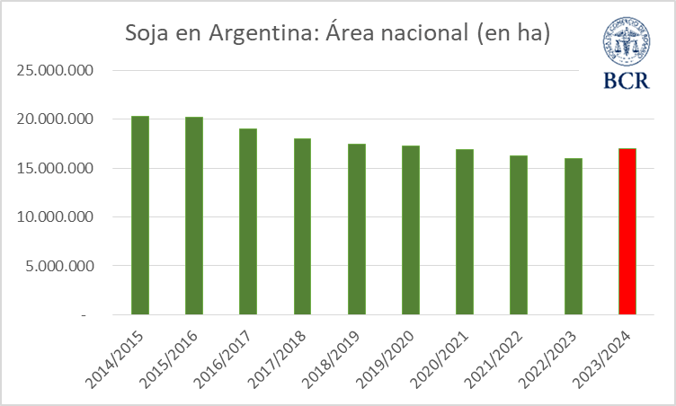 La BCR precisó que, tras alcanzar las 20,25 millones de hectáreas en 2014/15, la siembra de soja fue descendiendo año a año hasta llegar a 15,97 millones de hectáreas. Significa que, a lo largo de una década, la oleaginosa perdió el 21% del área.
