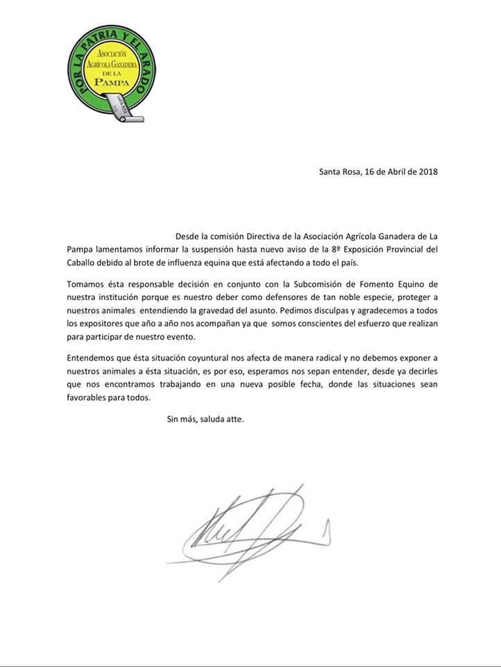 La comisión directiva de la Asociación Agrícola Ganadera de La Pampa suspendió la 8º Exposición Provincial del Caballo debido a un brote de influenza equina “que está afectando a todo el país”.
