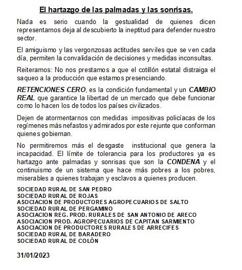 “No nos prestamos a que el cotillón estatal distraiga el saqueo a la producción que estamos presenciando. Retenciones cero es la condición fundamental y un (NdR: tipo de) cambio real que garantice la libertad de un mercado que debe funcionar como lo hacen los de todos los países civilizados”, resumieron.