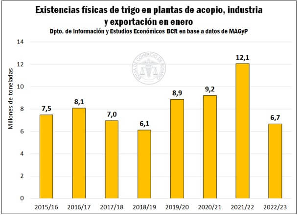 Los efectos de la seca ya empezaron a percibirse en el comercio exterior granario de la campaña 2022/23. De acuerdo a la Bolsa de Comercio de Rosario (BCR), en diciembre del año pasado se exportaron 1,52 millones de toneladas de trigo, que fue el segundo peor registro en volumen desde 2015.