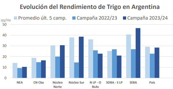 Pero una caída del 2,7% respecto al rendimiento promedio de las últimas cinco campañas (29,2 qq/Ha).