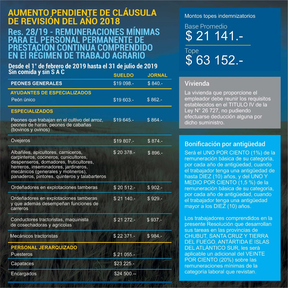 La Unión Argentina de Trabajadores Rurales y Estibadores (UATRE) anunció un incremento del salario mínimo para trabajadores rurales permanentes a través de la Resolución 28/2019.