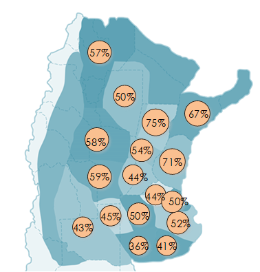 Los extremos se observan entre las zonas del Norte de Santa Fe y el Litoral Sur donde las empresas que necesitan financiar más del 40% de los costos de implantación representan respectivamente 75% y 71% mientras en la zona núcleo pampeana (Sur de Santa Fe y Norte de Buenos Aires) esa proporción es del 44%.
