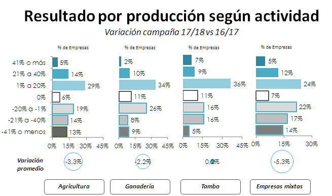 Debe señalarse también que a pesar del promedio hay algunos casos en los que la situación ha sido favorable. La investigación realizada en todas las regiones productivas argentinas, señala que un 29% de la muestra de empresas agrícolas logró un resultado por producción 1% a 20% superior en 2017/18 versus 2016/17, mientras que otro 19% registró un crecimiento superior a 21%. Contrastes similares se observaron en las empresas ganaderas y mixtas.