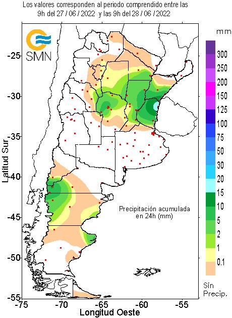 De acuerdo con datos del Servicio Meteorológico Nacional (SMN), y tal como lo había anticipado el pronóstico semanal de la Bolsa de Cereales de Buenos Aires, los mayores acumulados se dieron en el litoral argentino; fundamentalmente, en la provincia de Entre Ríos.