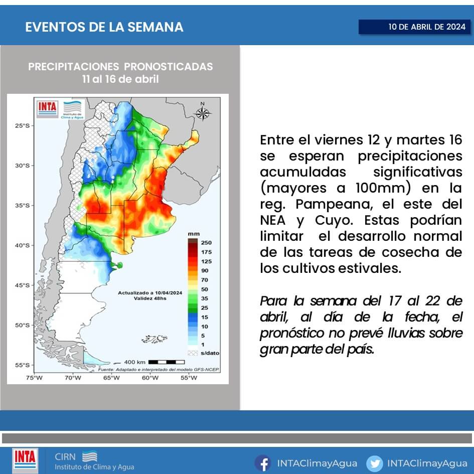 Del mismo modo, el Informe Agrometeorológico Semanal del Instituto de Clima y Agua del INTA señala: “Para los próximos 6 días se registrarían lluvias y tormentas de variada intensidad sobre el centro y norte argentino. Algunas localmente intensas sobre el área agrícola. Estas condiciones se esperan que persistan entre el viernes 12 y el martes 16″.