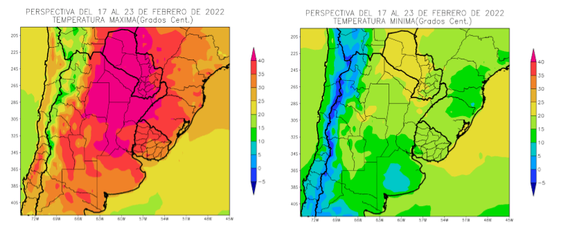 Para el caso del centro del NOA, el centro y el este de Cuyo, el sur de la Región Pampeana y la mayor parte del Uruguay se observarán máximas superiores a 35°, con focos de registros menores hacia las zonas costeras.