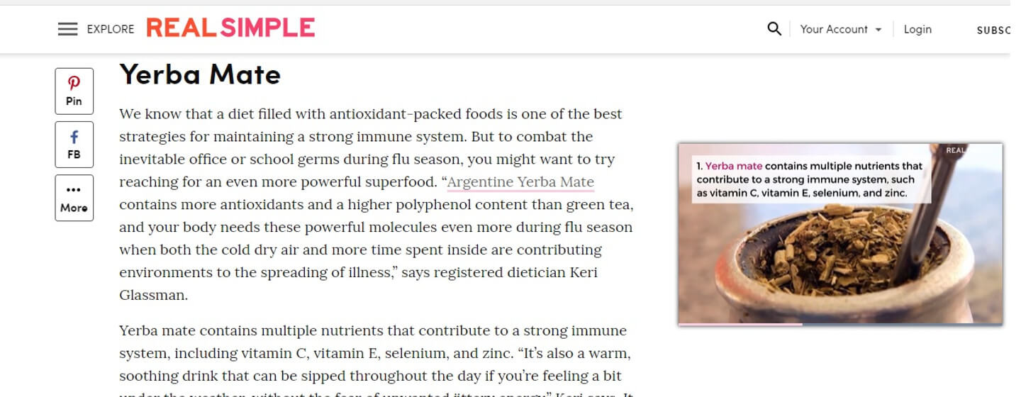 Bajo el título “Tres ingredientes que estimulan la inmunidad”, el informe destaca a la yerba mate argentina como un ingrediente principal recomendado por los dietistas para ayudar a estimular el sistema inmunológico y prepararse para la temporada de resfriados y gripe. Cita como fuente a Keri Glassman, una reconocida influencer de la vida sana y aliada estratégica del INYM en los Estados Unidos.