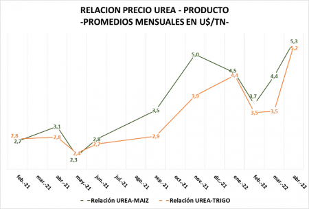 La relación insumo/producto (precio de la tonelada de urea /precio de la tonelada de cereal) es contundente, advierte la Bolsa: es necesario producir un 60% más de maíz y 53% más de trigo, en relación a hace un año, para comprar la misma cantidad de fertilizante (5,3 kilos de grano por kilo de fertilizante versus 3,1 para maíz ; 5,2 versus 2,8 para trigo) -Ver Gráfico-.
