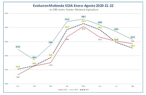 En la comparativa interanual, la industria procesó 2,28 millones de toneladas menos de poroto. Este escenario representa, de acuerdo a estimaciones de la Cámara de la Industria Aceitera y el Centro de Exportadores de Cereales (CIARA-CEC) una pérdida de U$S 1.300 millones en divisas y al equivalente en pesos por U$S 415 millones en derechos de exportación.