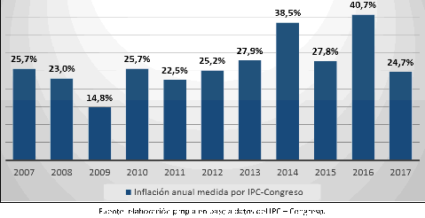 En el siguiente grafico se presenta la inflación anual desde el año 2007 hasta 2017. Se toma como referencia el Índice de Precios al Consumidor presentado por el Congreso (IPC-Congreso), dado que las estadísticas publicadas por INDEC (Instituto Nacional de Estadísticas y Censos) para el período 2007-2015 fueron desacreditadas oficialmente por el organismo. Cabe aclarar que en 2016 y 2017 INDEC vuelve a publicar un índice de precios nacional; y que las cifras oficiales actualmente han vuelto a tener consistencia en términos de indicadores alternativos.