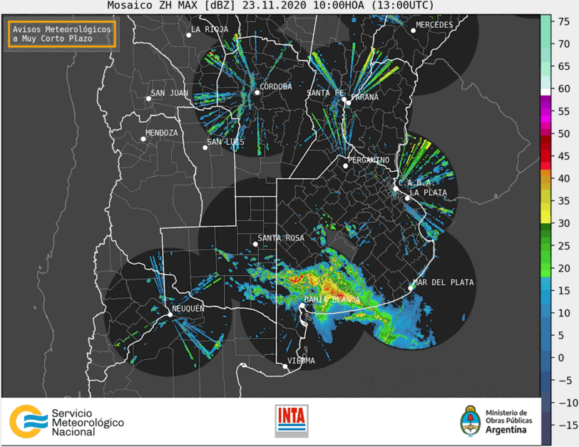 “En parte de la región se desarrollan tormentas. Algunas de ellas pueden provocar abundante caída de agua en cortos períodos, fuertes ráfagas, ocasional caída de granizo e intensa actividad eléctrica. Los valores de precipitación acumulada estarán entre 20 y 40 mm, pudiendo ser superados localmente sobre el centro y sudeste de La Pampa y sudoeste de la provincia de Buenos Aires”, dice el parte del Servicio.