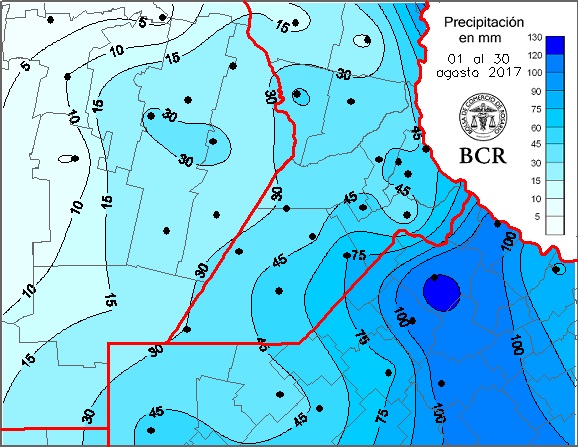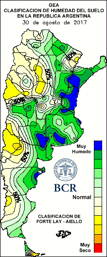 Se siguió profundizando la polaridad de las lluvias entre el sector oriental de Buenos Aires y Córdoba, que ya se venía expresando en julio. En Marcos Juárez, una de las más beneficiadas por las precipitaciones en Córdoba, ha recibido solo 35 mm en el mes. La desigual distribución de lluvias de agosto genera panoramas distintos, pero que terminan bajando la condición de los trigos. Por los excesos de agua y por su falta, los cuadros agrupados como muy buenos a excelentes pasaron de un 70% al 55%. Los de condición buena son ahora el 20% (una semana antes eran el 7%). Los regulares suben dos puntos al 20%. Los malos permanecen cuantificados con un 5%.
