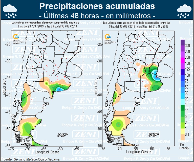 Un mapa muy gráfico del Servicio Metereológico Nacional muestra las últimas 48 horas de precipitaciones. En él, se ve claramente que las lluvias se concentraron en el norte de la provincia de Buenos Aires, el sur de Santa Fe y Entre Ríos y, el sudeste cordobés.