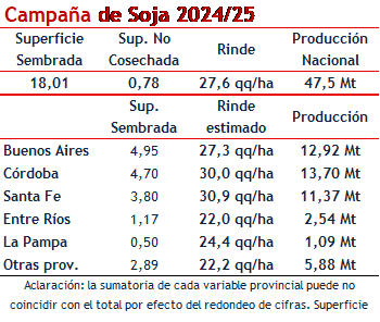 En el panorama provincial, en Buenos Aires se estima un rinde medio de 27,3 qq/ha frente a 31,4 qq/ha del año pasado. En Córdoba, la diferencia no es tan amplia, pero deberá llover para que esto siga siendo así; por ahora se prevén 30,0 qq/ha vs 31,3 qq/ha de la campaña pasada. En Santa Fe sí se nota la diferencia. Tras el boom del año pasado, en el que la soja rindió un promedio provincial de 39,1 qq/ha, este ciclo se estima una media de solo 30,9 qq/ha.