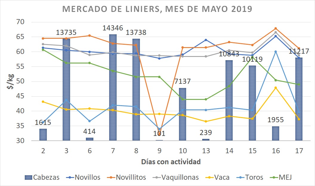 Con 14346 cabezas, el martes 7 se posiciona como día de más ejemplares comercializados durante mayo, mientras que el día más bajo fue el jueves 9, con una plaza de 101 animales.