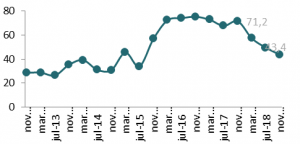 Y continúa: “cabe destacar que los índices anteriores pueden ser calculados para una actividad específica. En este sentido, el índice que considera sólo empresas que desarrollan la actividad agrícola fue 42,7. Este valor se encuentra 7,2 puntos por debajo de julio 2018 y 25,8 por debajo de noviembre de 2017. El índice que considera sólo empresas que desarrollan la actividad de ganadería bovina fue 43,6. Este valor está 5,3 puntos por debajo de julio 2018 y 18,4 por debajo de noviembre de 2017”.