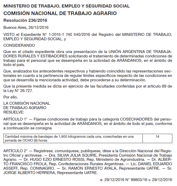 A través de la Resolución 116/2018, la Comisión Nacional de Trabajo Agrario suspendió “los efectos jurídicos de la Resolución de la Comisión Nacional de Trabajo Agrario N° 236/16, hasta el 30 de noviembre de 2019, a los efectos de la realización de estudios técnicos con respecto a la actividad ARANDANERA”.