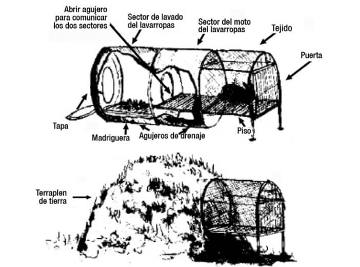 - El agujero de observación de la madriguera puede ser de 30 x 30 cm aproximadamente. En el modelo con loza que muestra el dibujo, se toma como molde una lata de dulce de batata o el fondo de un balde plástico de 20 litros.