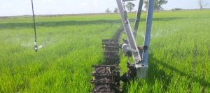 Lo que se está probando es la tracción en terreno barroso, y lo están haciendo con orugas con cinta de caucho, orugas de chapa, ruedas de plástico Rhinogator y sistemas duales para encontrar la manera más confiable de ‘calzar’ al pívot en las arcillas entrerrianas.