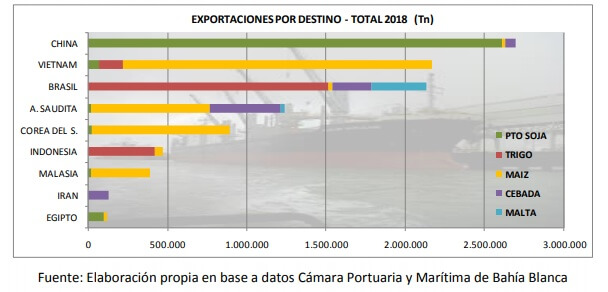 Para finalizar, el informe precisó que en 2019, China desplazó a Brasil como principal destino de los productos embarcados en el puerto de Bahía Blanca, seguido por Brasil y Vietnam.