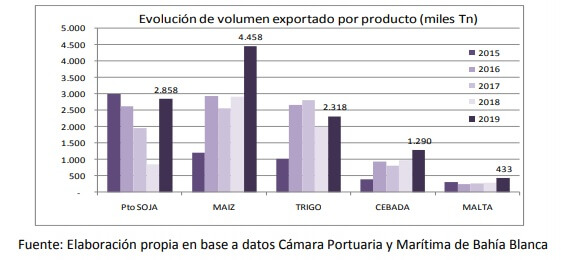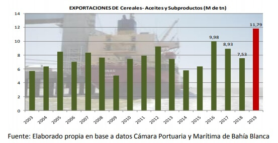 La Bolsa de Cereales y Productos de Bahía Blanca (BCPBB) publicó su informe anual de movimiento portuario, en cuál destacó que el volumen exportado en 2019 de cereales, oleaginosos y subproductos aumentó un 57% respecto de el de 2018 y, sumó un total de 11,70 millones de toneladas de cereales, y alcanzó una nueva marca récord para la terminal marítima.