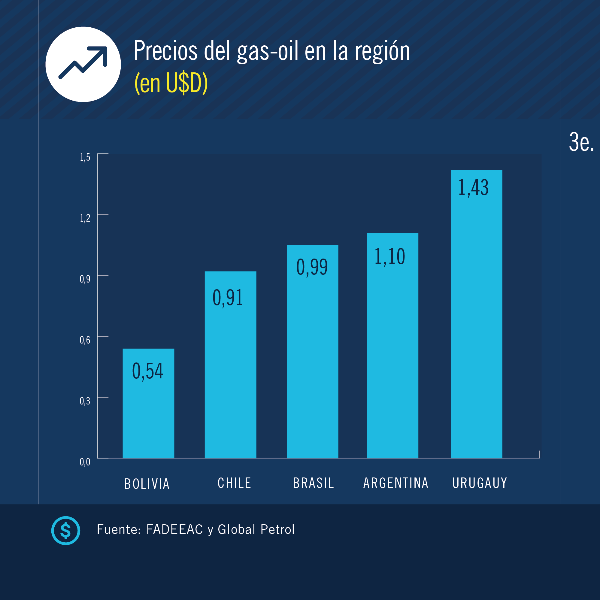 En ese marco, “Argentina todavía mantiene los precios del gas-oil en dólares más altos de la región con excepción de Uruguay, con una diferencia de casi 12 % respecto a Brasil y de más de 20 % en relación a Chile”, sostuvo Fadeeac.