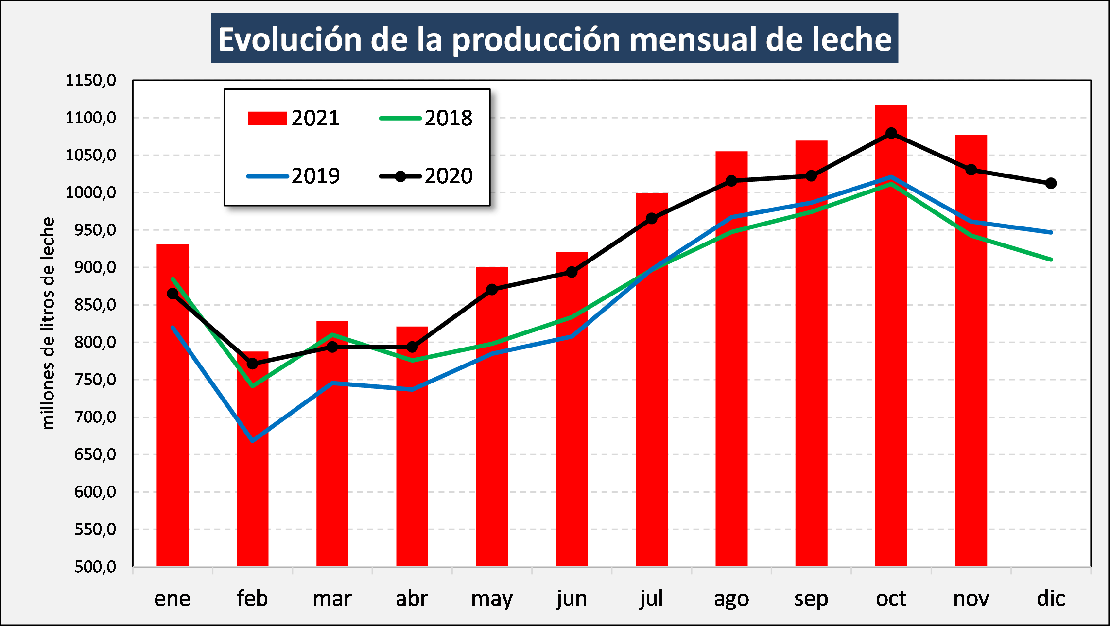 De acuerdo a los datos del Observatorio de la Cadena Láctea Argentina (OCLA) la producción de leche de nuestro país alcanzó en noviembre de este año una producción de 1.077 millones de litros de leche, lo que implica un aumento del 4,5% a igual mes del año anterior y una caída del 3,5% respecto a octubre de este año.