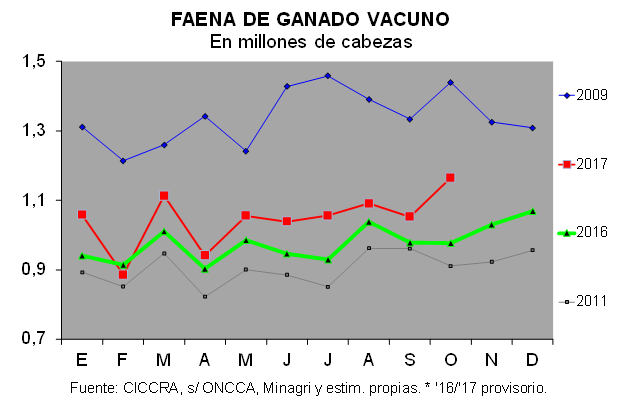 Según el informe de la Cámara de la Industria y Comercio de Carnes y Derivados de la República Argentina (CICCRA), “la faena de hacienda vacuna creció en forma significativa durante octubre de 2017, merced a la mejora de las condiciones climáticas. En total se faenaron 1,165 millones cabezas, lo que arrojó un avance de 10,7% con relación al mes previo y una suba de 19,2% en comparación con octubre de 2016. En términos absolutos, se faenaron casi 188 mil cabezas de hacienda vacuna más que en el mismo mes del año pasado”.