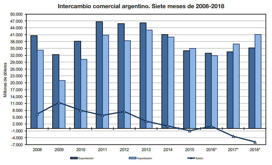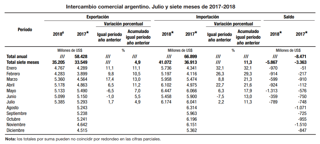 “En julio de 2018, las exportaciones alcanzaron 5.385 millones de dólares y las importaciones, 6.174 millones de dólares. El déficit en la balanza comercial fue de 789 millones de dólares. Las exportaciones crecieron 1,7% respecto al mismo mes del año anterior (aumento de 92 millones de dólares). Los precios subieron 11,1% y las cantidades cayeron 8,4%. Las exportaciones de productos primarios disminuyeron de manera interanual 23,3%. Las exportaciones de manufacturas de origen agropecuario (MOA) cayeron 2,8%; las de manufacturas de origen industrial (MOI) aumentaron 14,5%; y las exportaciones de combustibles y energía aumentaron 199,1%. En términos desestacionalizados, las exportaciones totales de julio aumentaron 5,7% respecto del mes anterior”, indicó el Instituto.