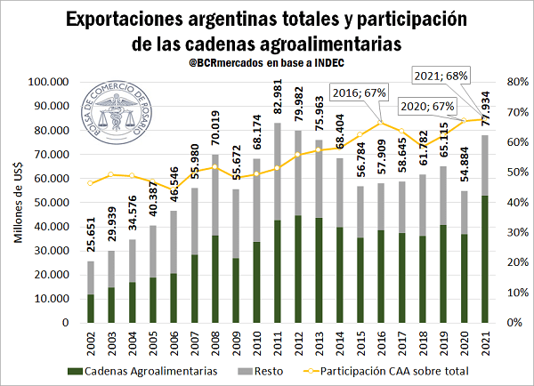 La Bolsa de Comercio de Rosario (BCR) también realizó un informe sobre la Balanza Comercial, donde se destaca que las cadenas agroalimentarias generaron en 2021 un 43% más que lo exportado en 2020, y registraron su mejor performance exportadora de la historia, superando en un 18% el récord previo del año 2012.