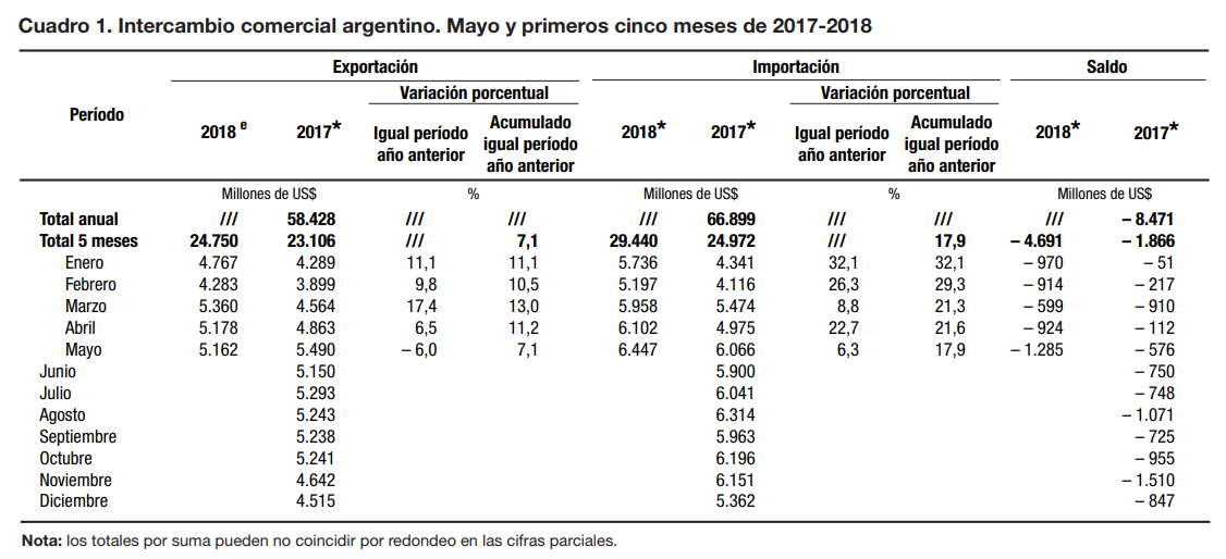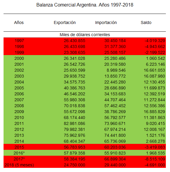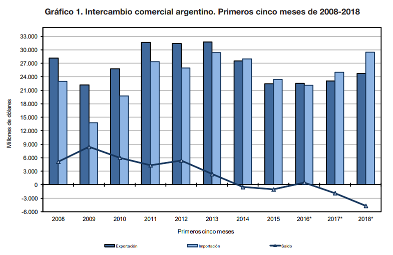 En el déficit acumulado de los primeros cinco meses del año ya superó los 4.690 millones de dólares, pero si se tiene en cuenta el año 2017, ya son 17 meses consecutivos que la Balanza Comercial Argentina no reporta un mes positivo, y el egreso de dólares del país alcanza los 13.206 millones de dólares.