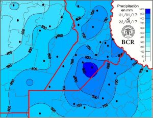 “En el sur de Santa Fe, la localidad de Labordeboy muestra desde el 1ro de enero un acumulado de 997 mm. Chovet le sigue con 895 mm. Buena parte de las localidades del centro y sur de Santa Fe están por encima de los 700 mm anuales cuando aún falta bastante para alcanzar la primera mitad de este 2017”, informó la Guía Estratégica para el Agro.