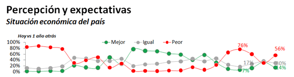 Un 56% de los encuestados percibe que la situación del país se encuentra peor respecto de un año atrás, mientras que esa proporción es del 27% en el caso de la situación económica y financiera de las propias empresas agropecuarias. En cuanto a las expectativas a futuro, un 56% de los encuestados considera que el país estará peor dentro un año y un 50% cree que la situación de su empresa empeorará para ese mismo momento.