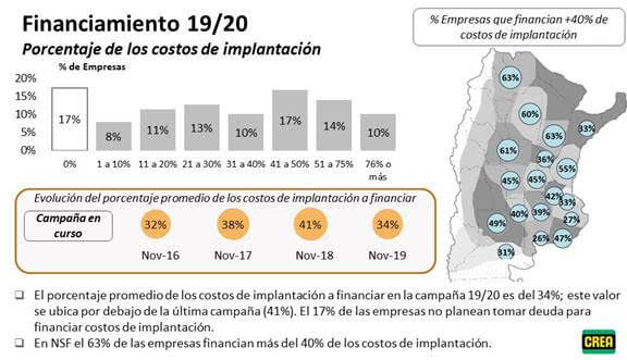 La inestabilidad macroeconómica registrada durante los últimos meses del año limita las opciones de financiamiento, razón por la cual la proporción del costo promedio por financiar, según lo indicado por los encuestados, se ubica en un 34% en el presente ciclo, una cifra inferior al 41% y 38% registrado en noviembre de 2018 y 2017 respectivamente. A su vez, los buenos resultados de la campaña 2018/19 contribuyeron a la posibilidad de adelantar el pago de algunos insumos, una decisión tomada por casi 1 de cada 2 empresarios CREA en el contexto reciente.