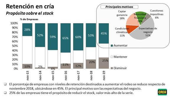 Un 25% de los empresarios ganaderos señaló que tiene planes de reducir el propio rodeo; el principal motivo de esa decisión es la falta de expectativas favorables. Se trata de la cifra más elevada desde que CREA comenzó a relevar el dato en el marco de la Encuesta SEA (2013). De todas maneras, vale resaltar que, a pesar del contexto, la mayor parte de los empresarios ganaderos consultados planea mantener o aumentar su rodeo de cría.