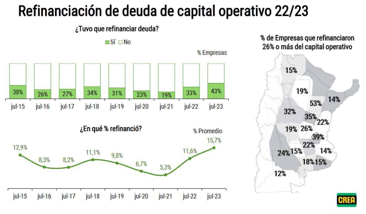 De acuerdo con el relevamiento, el 43% de los empresarios CREA agrícolas debió refinanciar deuda tomada para financiar el capital de trabajo empleado en el ciclo 2022/23. El nivel promedio refinanciado se ubicó en torno al 16% del capital. En ambos casos se trata de las cifras más elevadas de la serie histórica.