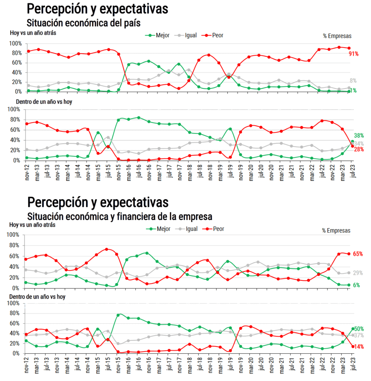 En principio, si uno se queda con la foto de la situación actual, el 91% de las empresas asegura que la situación económica del país está peor que hace un año y el 65% afirma que su situación económica y financiera, a nivel empresarial, también empeoró respecto al año pasado.