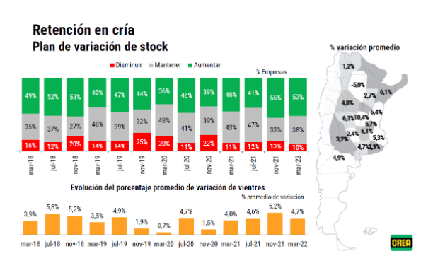 Un aspecto positivo también es que los establecimientos de cría proyectan destetar en promedio un 2,4% más de terneros que en 2021, lo que representa un importante logro, pues muchas regiones resultaron afectadas en los últimos meses por sequías e incendios.