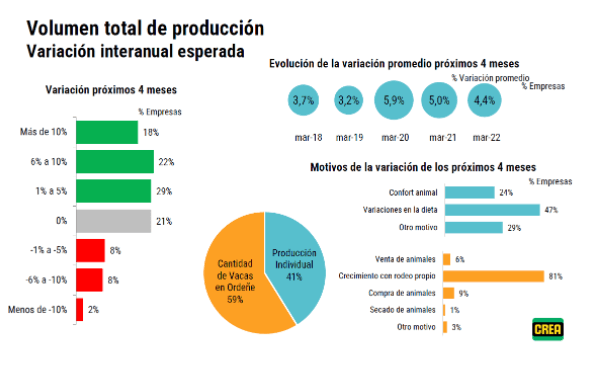 Aún cuando dos de cada tres encuestados indicó que sufrió sequía como adversidad climática en el último ciclo, se espera un aumento en la producción de leche en los próximos cuatro meses a causa principalmente de un incremento de la cantidad de vacas en ordeñe.