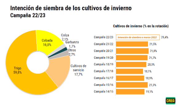 En cuanto al trigo, la siembra de trigo registraría un descenso relativo dentro de la torta de siembras invernales: el 60% de las hectáreas, contra el 66% del año pasado. Pero como la superficie general implantada en invierno se incrementará de una participación en la rotación del 21,5% a una del 29,4%, “en términos nominales el área de trigo se mantiene estable”, menciona CREA.