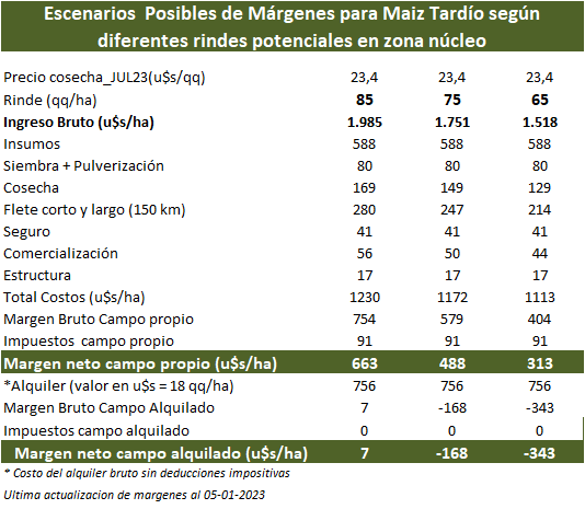 En tanto, “si bien en campo alquilado el productor debe afrontar un rinde de indiferencia muy elevado, 75 qq/ha (casi el doble que lo que se requiere en campo propio: 39qq/ha), en campo propio también habrá pérdidas cuantiosas. Haber sembrado maíz en forma temprana y no obtener producción le costará al dueño enfrentar un margen neto de -789 U$s/ha”, añadió.