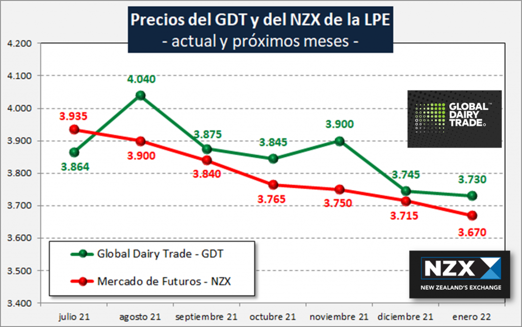 En lo que respecta a los futuros, se puede evidenciar una gran diferencia para el GDT y el Mercado de Futuros del NZX (New Zeland Exchange), pero al tendencia continúa siendo la misma, donde el precio de la tonelada de leche en polvo entera para enero de 2022 en el primer mercado es de 3.730 u$s/ton y de 3.670 u$s/ton para el segundo.