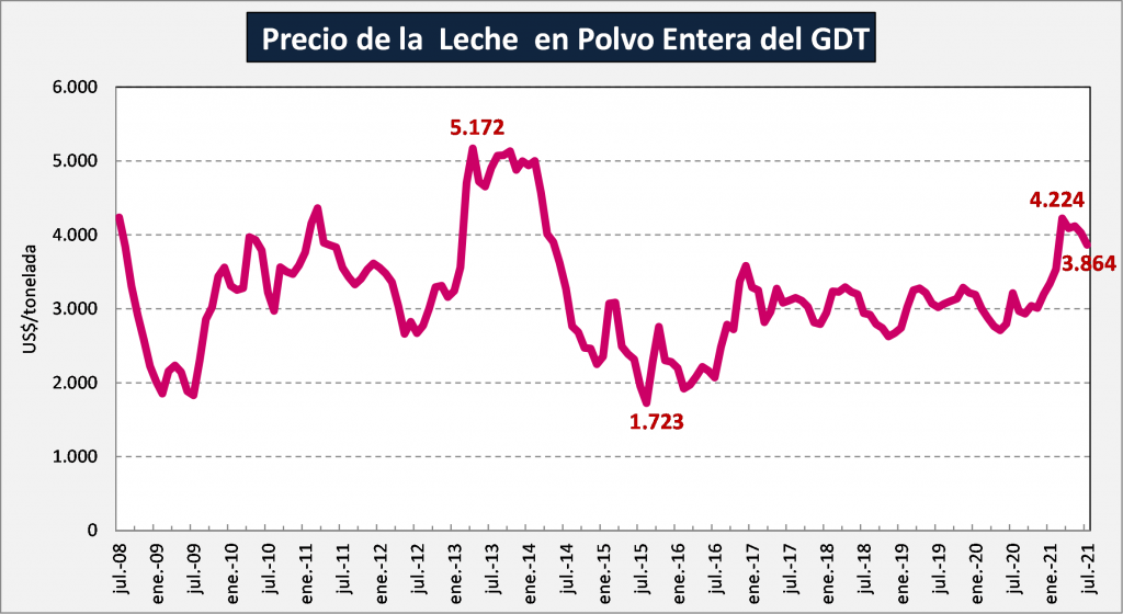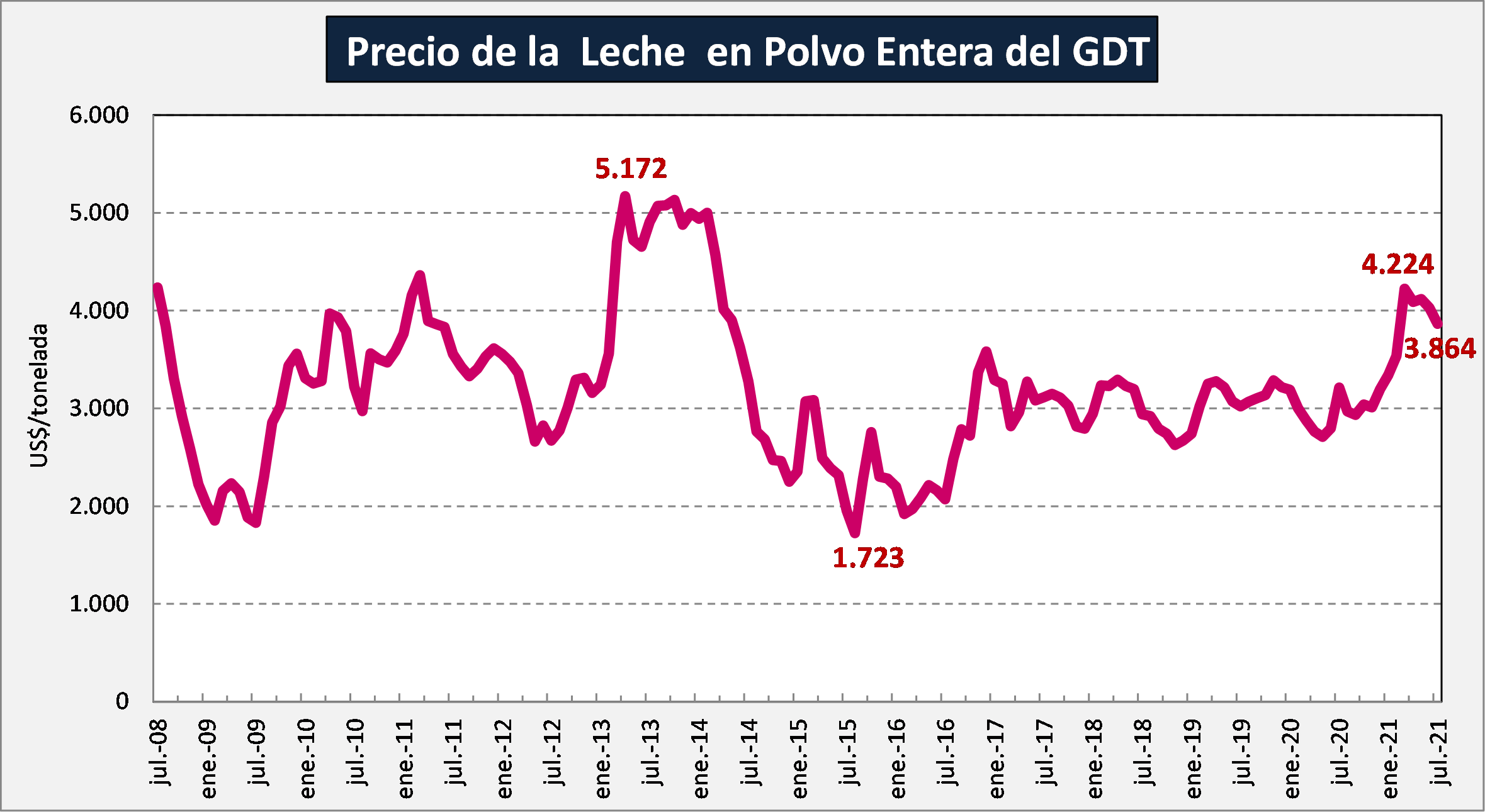 En la subasta N° 287 del Global Dairy Trade (GDT) correspondiente a julio de 2021 el precio internacional de la leche en polvo entera cayó 3,6% respecto a la subasta anterior, alcanzando un precio de 3.864 u$s/ton.
