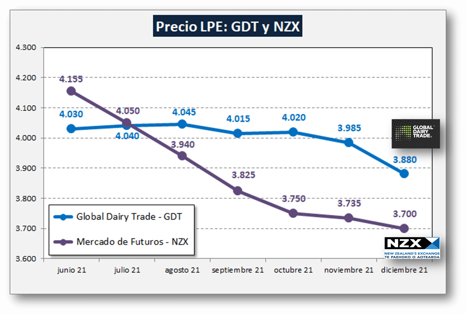 Analizando otro mercado, el OCLA indica que, a diferencia del GDT, las cifras NZX (mercado de futuros de Nueva Zelanda) muestran otro panorama. En este caso, los precios son superiores para el precio de la leche en polvo entera para junio, pero caen a partir de agosto hasta llegar a un valor de 3.700 dólares la tonelada (Ver gráfico).