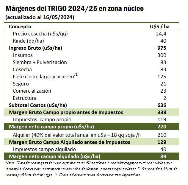 Mientras que en campo alquilado también han mejorado en 79 u$s/ha, pasando de un incipiente margen positivo de 10 u$s/ha a 89 u$s/ha.