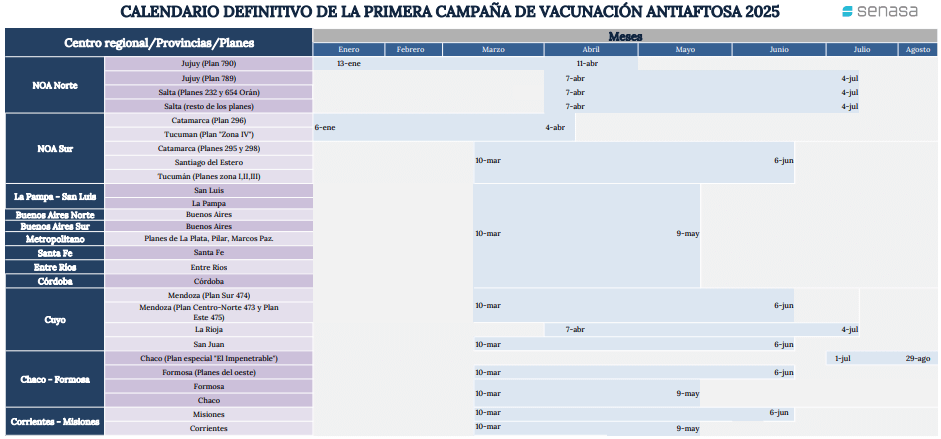 El Servicio Nacional de Sanidad y Calidad Agroalimentaria (Senasa) informó que el próximo lunes 10 de marzo iniciará en la mayoría de las provincias argentinas la primera campaña de vacunación 2025 contra la fiebre aftosa.