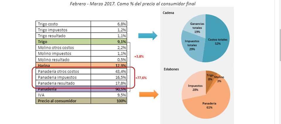 “En cada eslabón se tiene en cuenta otros costos (no incluye materia prima) y resultados (margen de ganancia). Es lógico que la panadería explique la mayor parte, ya que combina producción y comercialización, con uso intensivo de mano de obra, costos de servicios y costos inmobiliarios de alquiler. Asimismo, las escalas son totalmente distintas, la producción de trigo y harina se realiza a gran escala, mientras que la de pan es casi artesanal”, agregó.